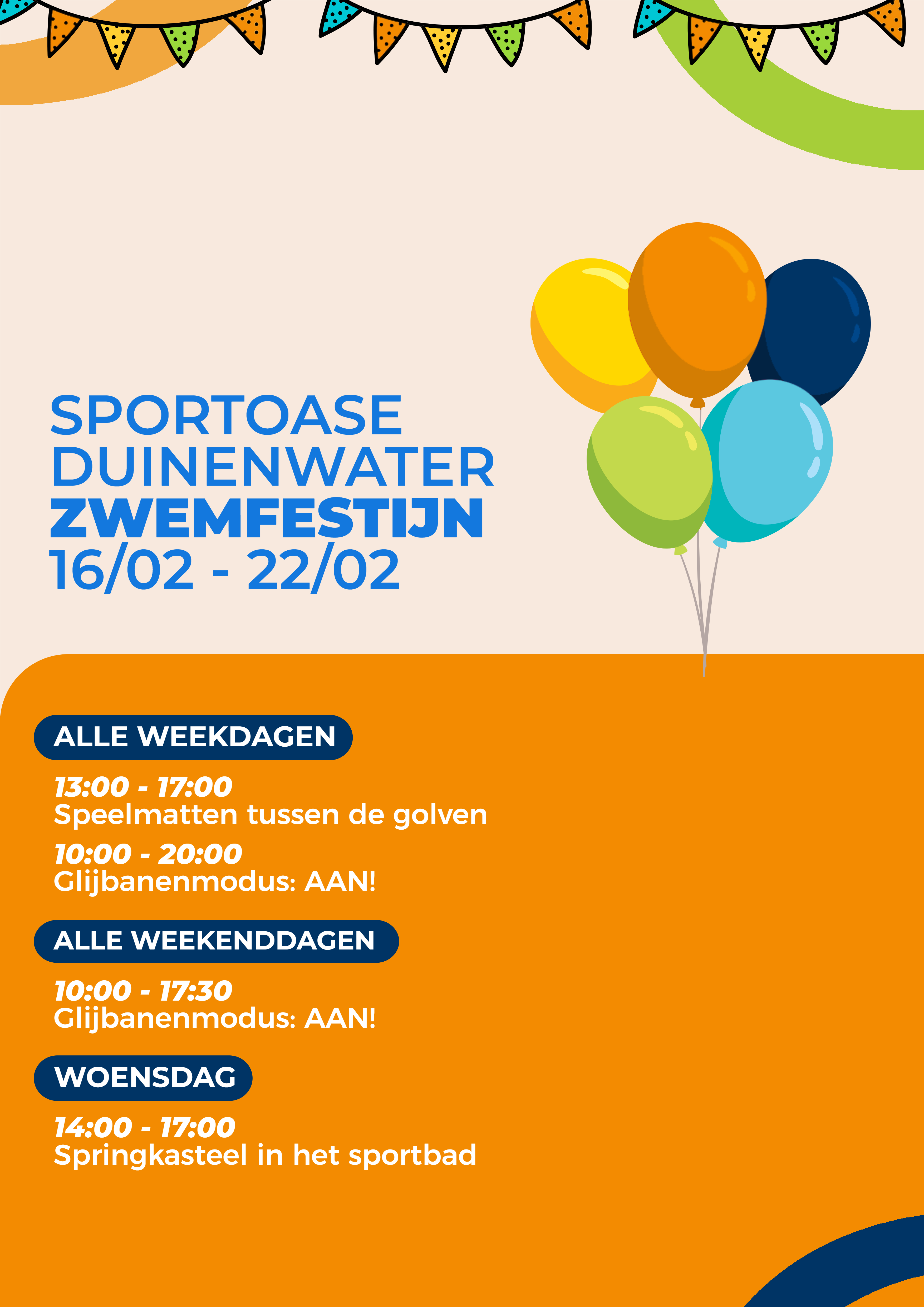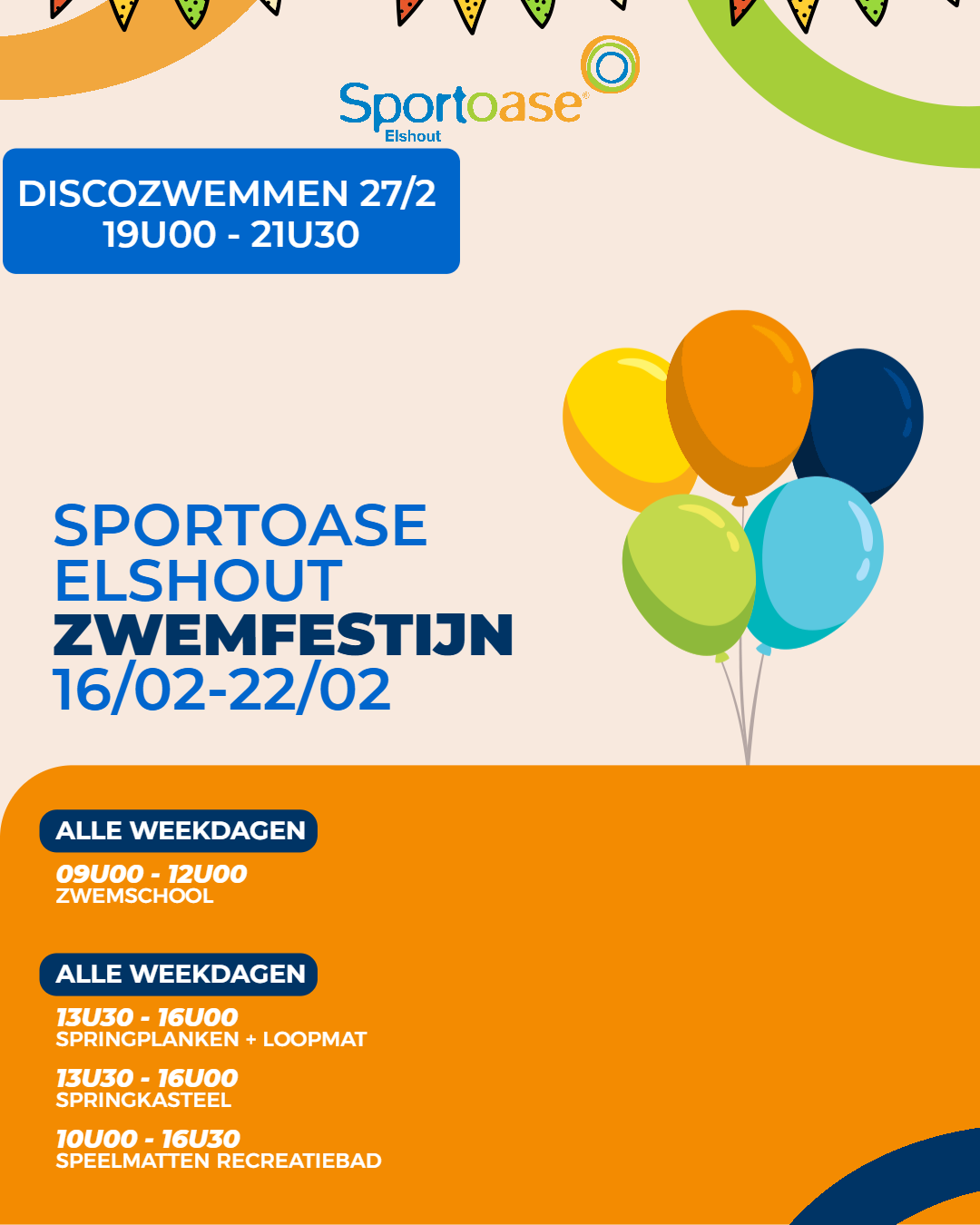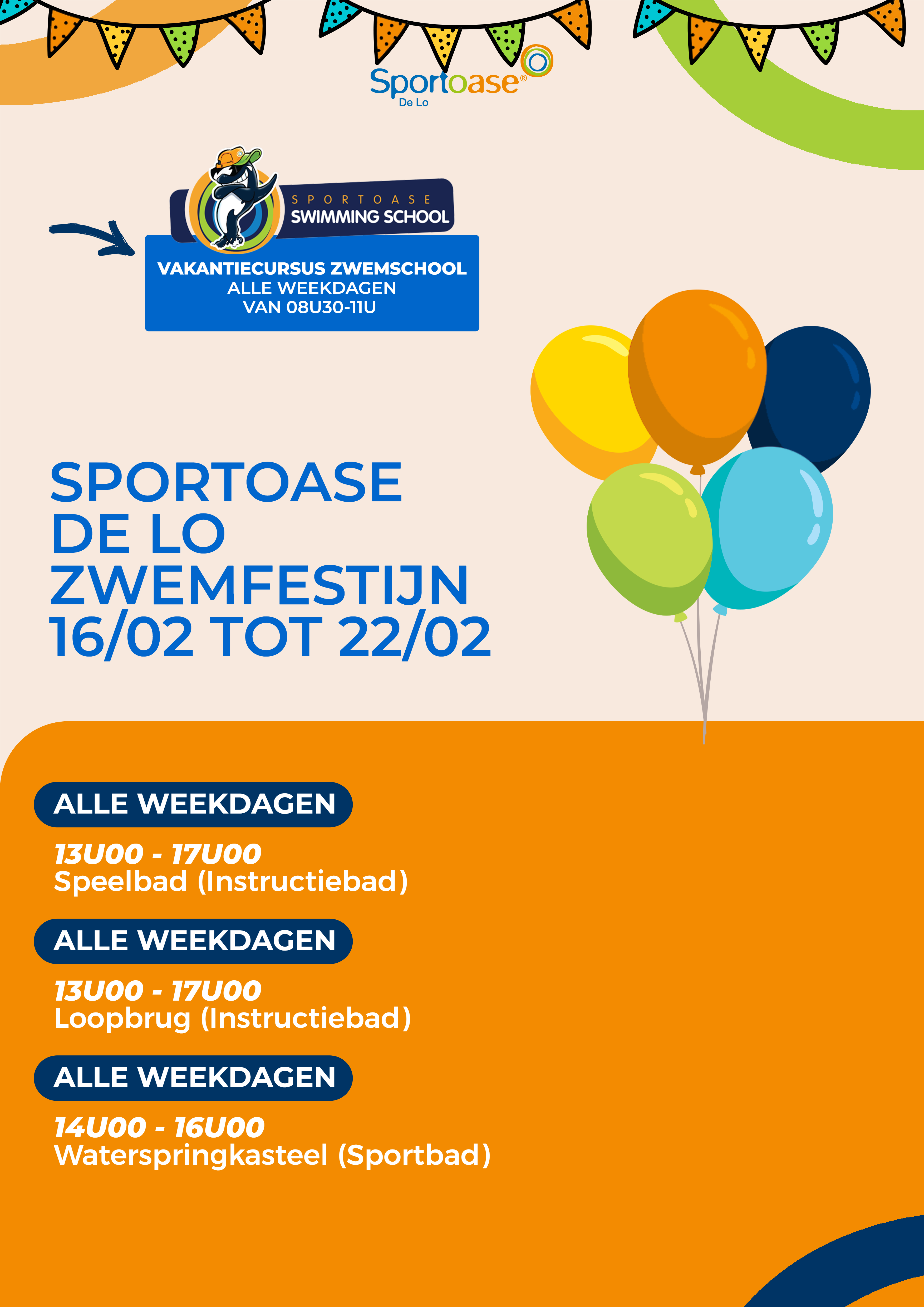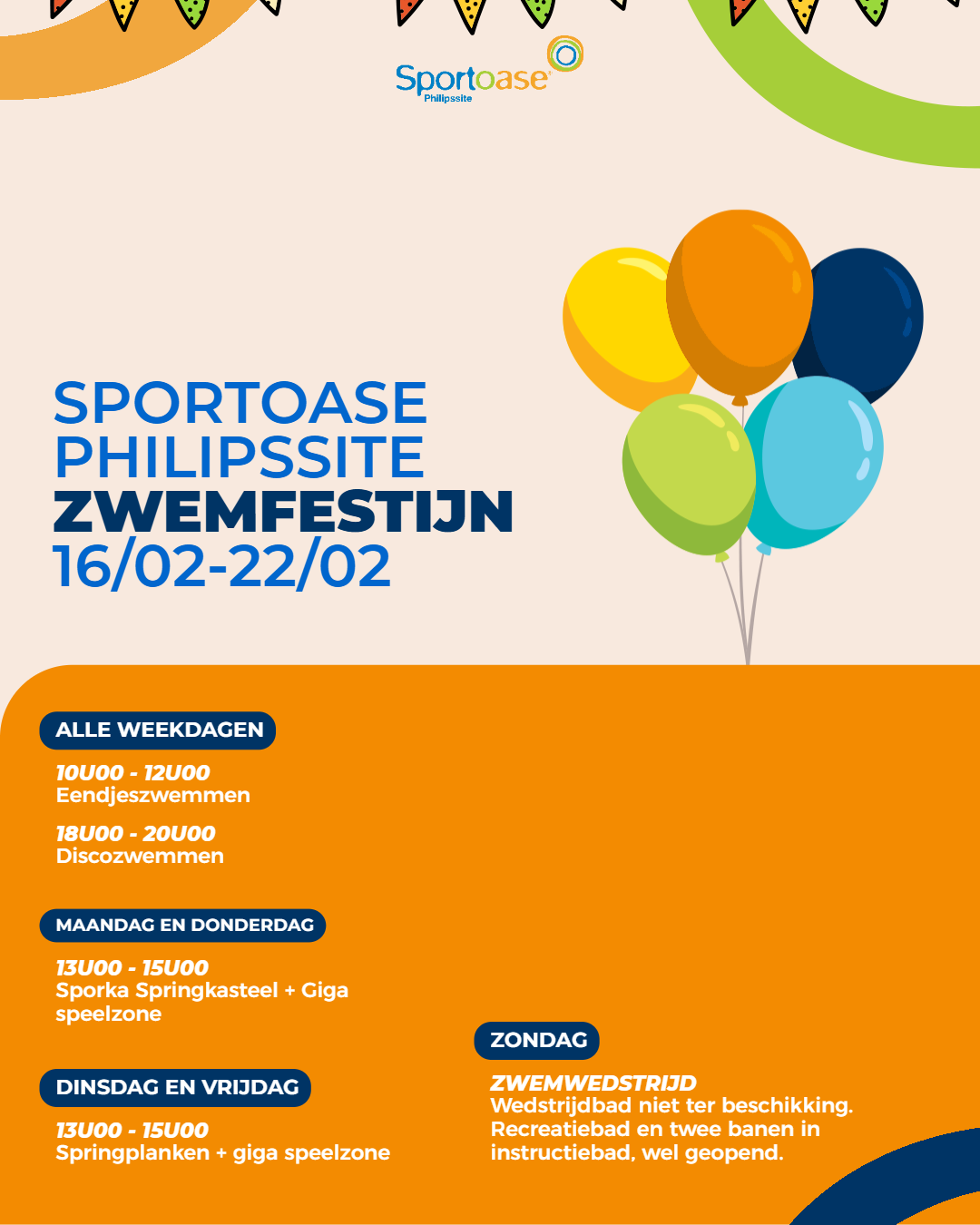 Van een eendjesbad, tot een reuze Sporka speelbad of zelfs een gigantisch springkasteel middenin het zwembad, tijdens het Zwemfestijn bij Sportoase zorgen we elke dag voor een leuke verrassing. Kom en beleef zo extra veel speelplezier tijdens de krokusvakantie. Benieuwd wat jouw favoriete Sportoase-centra in petto heeft? Ontdek dan hieronder de volledige planning.