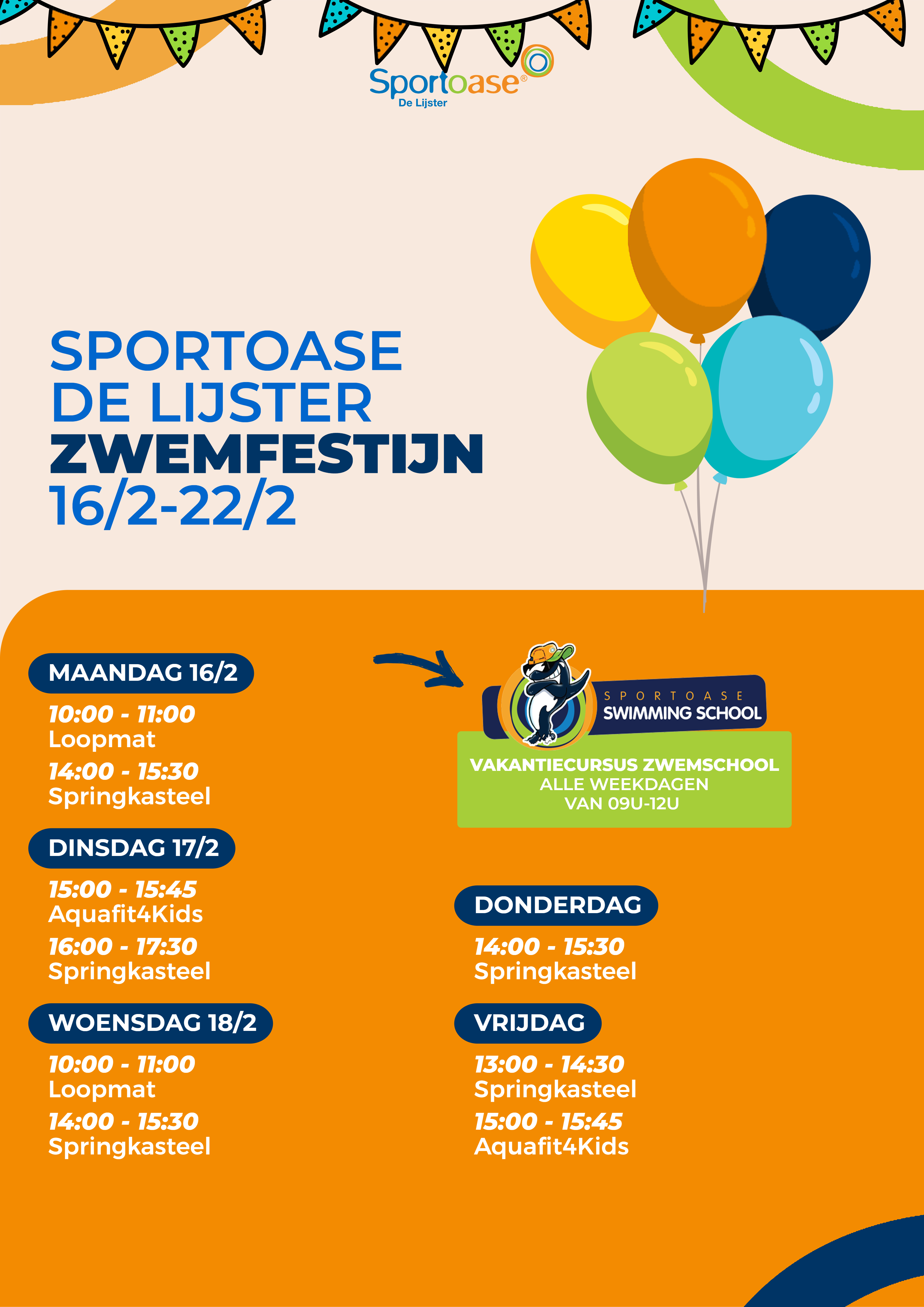 Van een eendjesbad, tot een reuze Sporka speelbad of zelfs een gigantisch springkasteel middenin het zwembad, tijdens het Zwemfestijn bij Sportoase zorgen we elke dag voor een leuke verrassing. Kom en beleef zo extra veel speelplezier tijdens de krokusvakantie. Benieuwd wat jouw favoriete Sportoase-centra in petto heeft? Ontdek dan hieronder de volledige planning.
