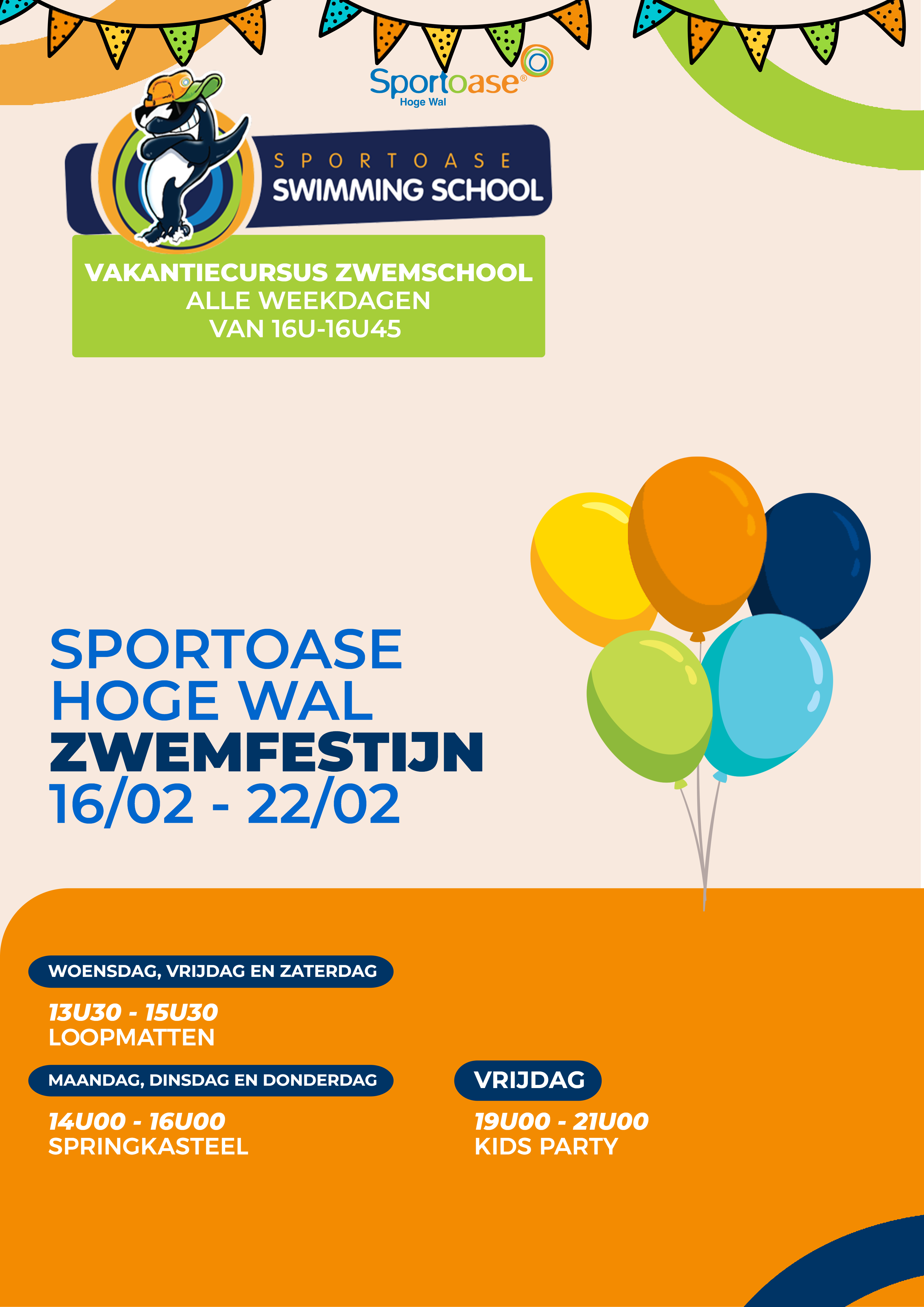 Op zoek naar veilig en vermakelijk speelplezier voor de kinderen tijdens de krokusvakantie? Zoek dan niet verder, want het Sportoase Zwemfestijn heeft het allemaal! De allerplezantste en meest spectaculaire waterattracties worden allemaal ingezet om jou en je kinderen een aangename dag te bezorgen in onze warme recreatiebaden. Kom, ontspan en geniet van 16 t.e.m. 22 februari bij Sportoase en beleef waterpret op z'n best!
